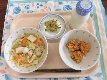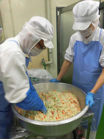 大豆のボール揚げは茹でた大豆をいかのすり身と小麦粉、片栗粉で作った生地に混ぜて作りました。大豆はたんぱく質が豊富で体を作る食品の一つです。たんぱく質というと、肉や魚が思い浮かぶことが多いですが、大豆もたんぱく質源になるとうことを子どもたちにも知ってもらいたいと思い、少しでも食べやすくなるよう油で揚げたり、隠し味にカレー味にするなど工夫しました。