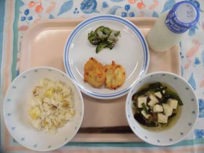 今日の給食:栗おこわ 豆腐とわかめのすまし汁 手作りさつま揚げ