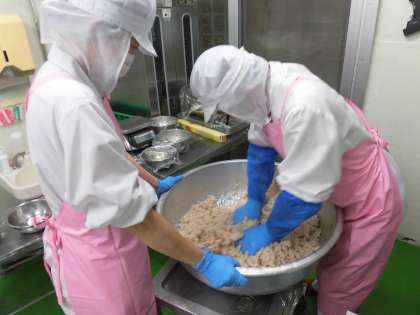 手作りさつま揚げは給食室で手作りしました。納品されるすり身は0度以下。手がしびれるくらい冷たいいかとたらのすり身20キロを練り合わせて作りました。手作りのさつま揚げはふわふわでとてもおいしく仕上がりました。