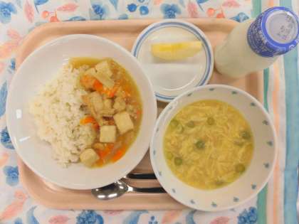 今日の給食:ご飯 豆腐とえびの中華炒め煮 卵とコーンのスープ