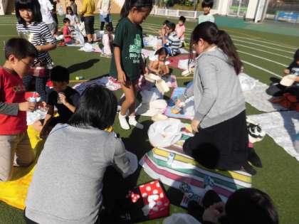 1年生の大きなレジャーシートをたたんであげている6年生もいました。