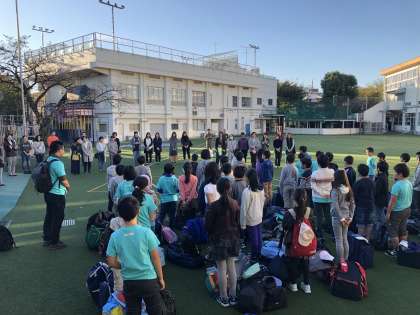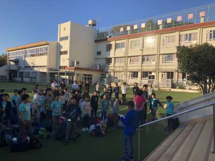 今日から4年生が自然宿泊体験教室です。まずは出発式です。