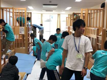 みんなでちからをあわせて、シーツ、枕カバーなどの取り付けです。