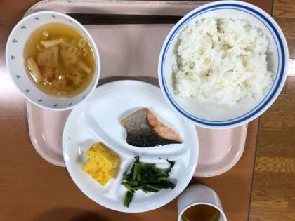 朝食は、シャケ、卵焼きなどです。