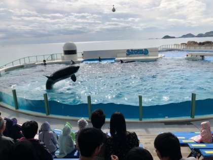 シャチのショーに大興奮。シャチに水をかけられた子も。