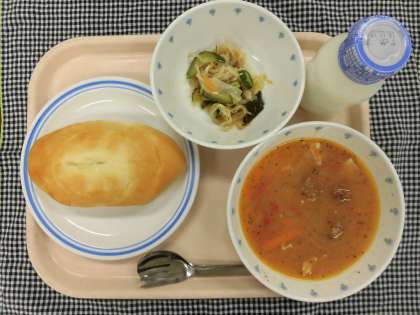 今日の給食:ソフトフランスパン あじボールのトマトスープ こんにゃくサラダ