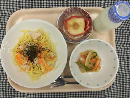 今日の給食:和風スープスパゲッティ 大根のおかかサラダ 焼きりんご