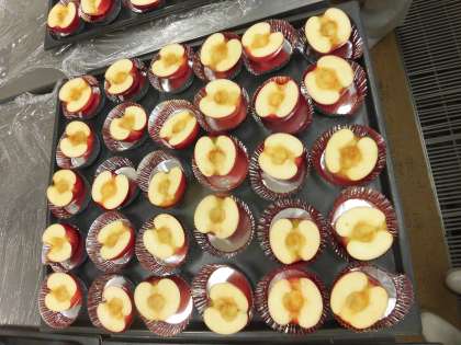 今日は「としょ献立」です。今回は学校図書館にりんごが出てくる本がたくさんあるので、季節のりんごを使った料理ということで「焼きりんご」にしました。学校図書館にあるりんごが出てくる本は日本だけでなく、世界各国にあり、りんごが世界中で食べられていることがわかります。日本ではりんごは生で食べることが多いですが、他の国々では生で食べる以外にもりんごを煮たり焼いたりする料理が多くあります。焼きりんごもその一つで、りんごに砂糖やシナモン、バターをかけ、オーブンで焼いた料理です。日本のりんごは生で食べた時においしいように品種改良されているので、加熱に適した「紅玉」というりんごを使って作りました。紅玉は酸味もあるので、そのまま食べると少し酸味を感じますが、焼いた時の甘みと酸味のバランスがとてもよいりんごです。皮も深紅でとてもきれいです。焼きりんご初めて!という子も何人もいましたが、おいしく食べていました。