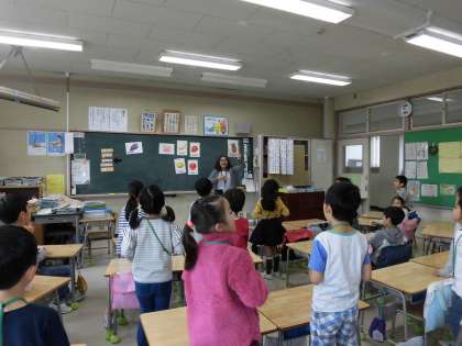 果物の名前の言い方を学習しました。ジェスチャーゲームをしたりフルーツバスケットをしたりして、楽しく英語に親しみました。