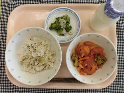 今日の給食:さつまいもご飯 いかと豆腐団子の煮物 野菜のゆかり和え