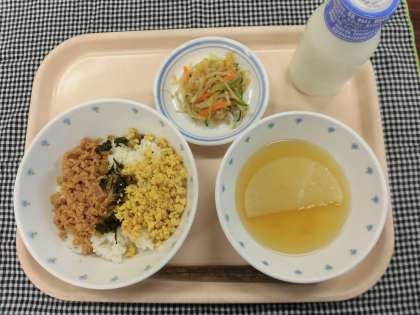 今日の給食:三色丼 大根のおでん煮 糸寒天のごま酢和え 牛乳
