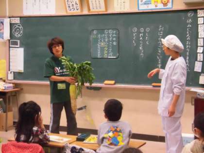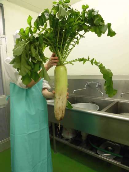 八雲小学校では東京都産の野菜を使った地産地消献立を提供していますが、今日は本当の意味での「地産地消」になりました。調理前に1.2年生に届いた大根を見せに行くと「おおきいー!!」と感嘆の声が上がりました。目黒区で生産された大根ということにもびっくりしていました。