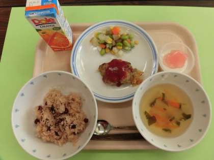 今日の給食 赤飯 やくもハンバーグ 八もくサラダ 紅白すまし汁