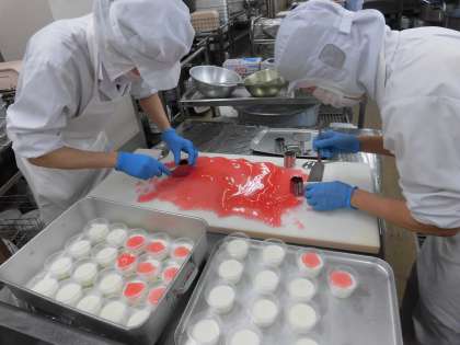 さくらゼリーはクランベリーゼリーを八雲小学校の校章の桜に抜き、ミルクゼリーの上に飾りました。思ったようにゼリーが固まらず、抜く作業が難航してしまいました。桜の形がうまくでなかったのですが、1.2年生の児童にそのことを伝えると、子どもたちが「私のは桜に見えるよ」「ぼくのは桜の花びらだねー」と優しい言葉をかけてくれました。