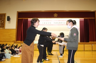 145周年記念集会が開催されました。まずは、校友会会長の木元さんから、八雲の歴史についてお話をいただき、続いてPTAから記念品の贈呈がありました。