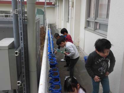 生活科の学習で鉢に植えた球根の芽が出始めました。大きく育つのが楽しみです。