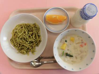 今日の給食 小松菜のジェノべーゼスパゲッティ