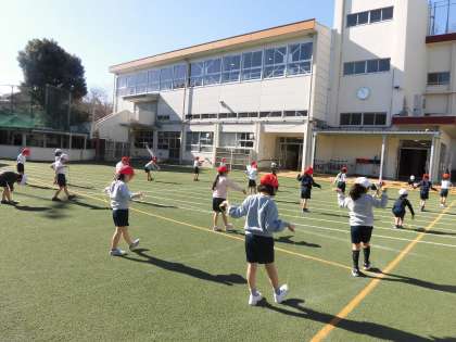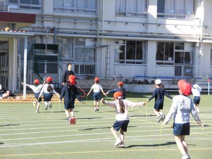 青空の下で、短縄をしました。縄跳びリレーをしたり名人に教えてもらった技の練習をしたりしました。