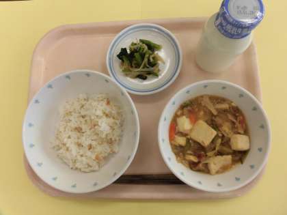 今日の給食 梅ご飯 肉豆腐 青菜のからし和え 牛乳