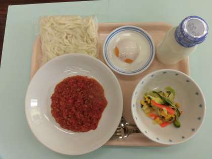今日の給食:ソフト麺ミートソース ゆで野菜のドレッシングソース
