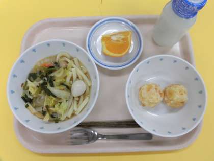 今日の給食 ちゃんこうどん じゃがまる いよかん 牛乳