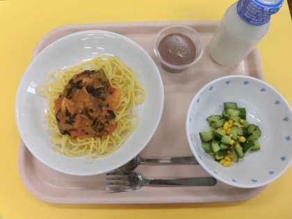 今日の給食 鶏肉とほうれん草のトマトクリームスパゲッティ