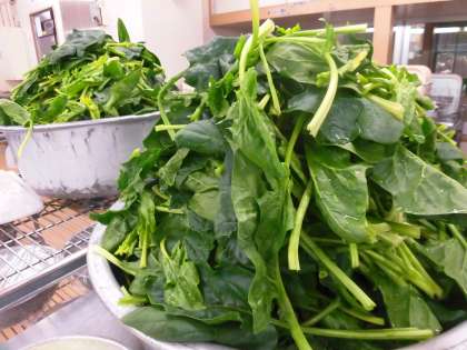 今日は地産地消の野菜を使った献立です。東京都八王子市で生産されたほうれん草を使い、鶏肉とほうれん草のトマトクリームスパゲッティを作りました。地産地消は「その地域で生産されたものをその地域で消費すること」を言います。生産しているところが消費する場所と近いことで、輸送時間が短く済むという利点があります。今日も給食室に新鮮なほうれん草がとどきました。たっぷり16キロものほうれん草を給食室で手作りしたソースに入れました。