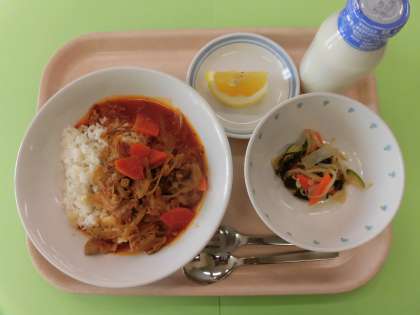 今日の給食 ハヤシライス こんにゃくサラダ はるか 牛乳