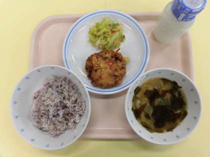 今日の給食 ゆかりごはん 手作りがんも 野菜の香味和え