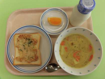 今日の給食 ツナトースト カレー風味の豆チャウダー