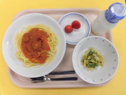今日の給食 スパゲッティミートボール グリーンサラダ いちご 牛乳