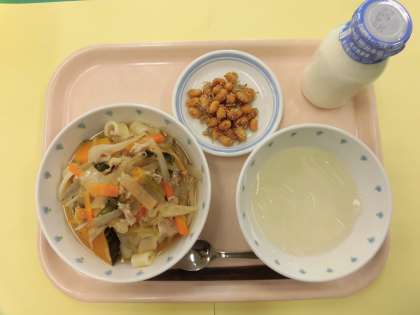 ほうとう 大豆とじゃこのカリカリ揚げ はちみつゆずゼリー 牛乳