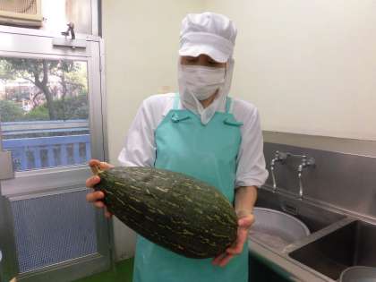 12月22日(土)は「冬至」です。冬至の日にはかぼちゃを食べる風習があることから、かぼちゃが入った「ほうとう」を作りました。かぼちゃは夏が旬ですが、今回は「冬至かぼちゃ」という東京都産のかぼちゃを使いました。形が普通のかぼちゃの形とは違い、とても大きいものでした。