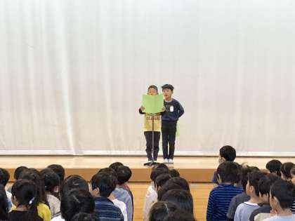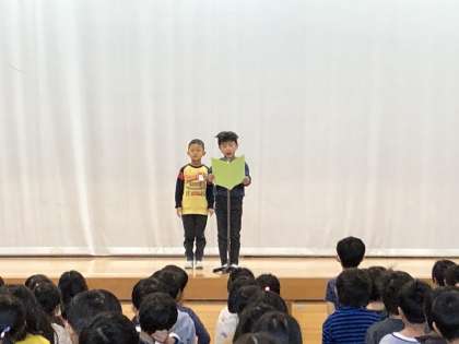 今日は、後期前半終了の日です。朝は、全校児童が集まり、後期前半終了の会がありました。1年生は各クラスの代表1名が、児童代表の言葉を発表しました。