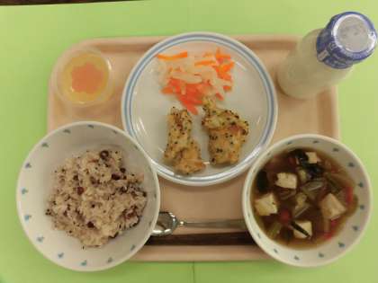 1月12日(日)は八雲小学校の開校記念日です。今年で創立146周年となりました。今日はお祝い献立です。日本で昔からお祝いの時に炊かれる「赤飯」は「赤」がめでたい色であることから、ささげという豆の煮汁を使い、赤い色をもち米につけています。