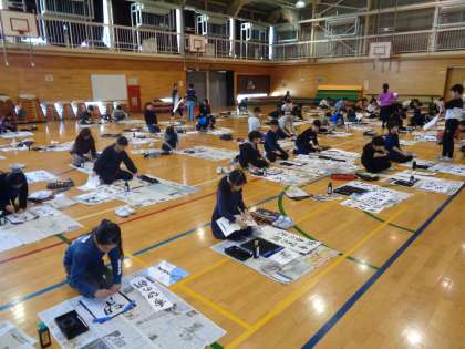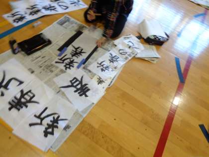体育館で書き初めをしました。みんな冬休みの練習を生かして一字一字、気持ちを込めて書きました。