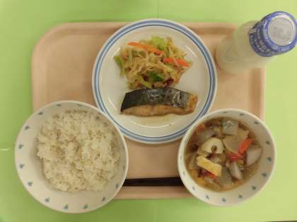麦入りご飯 鰆の幽庵焼き ゆで野菜のごま醤油かけ のっぺい汁 牛乳