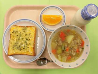 卵トースト 野菜スープ ネーブルオレンジ 牛乳
