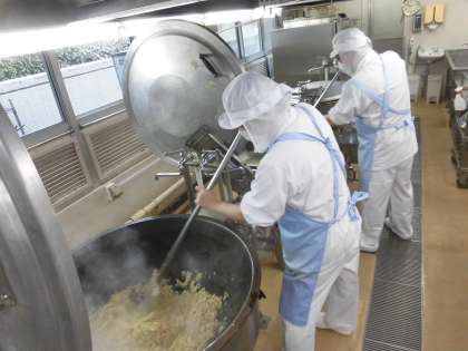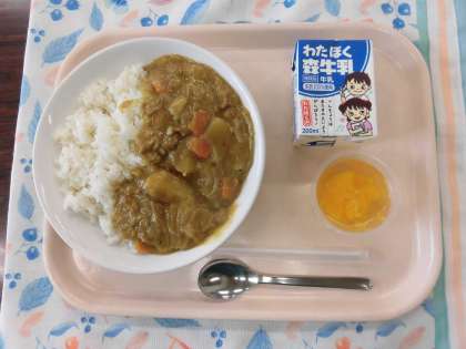 今日から給食が始まりました。初日のメニューはカレーライスです。八雲小学校のカレーライスはルウから手作りしています。じっくり時間をかけてルウを炒めます。玉ねぎもあめ色玉ねぎにしています。みかんゼリーはみかん缶を入れ、ゼリー液にはレモン果汁を入れた透明のゼリーです。