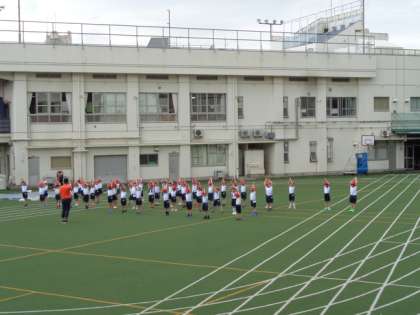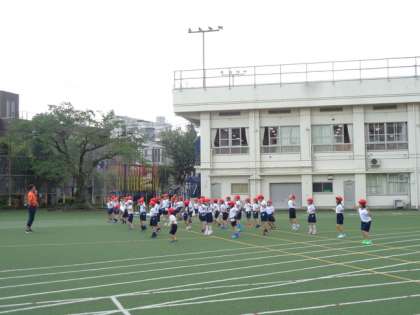 雨も上がり、校庭で体育を行いました。先生の動きを上手にまねて、すばやく動いています。