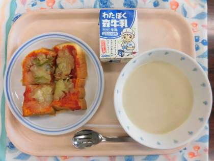 ピザトーストはピザソースに玉ねぎやベーコンをのせ、チーズをかけて給食室のオーブンで焼きます。ピザソースはホールトマトなどを煮込んで作っています。普段であれば、手を洗ったうえで、手でつかんで食べるとこですが、感染症予防からフォークを使って食べるために、トーストを4分割して提供しました。
