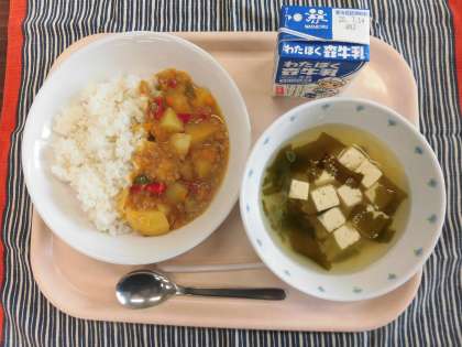マーボ−じゃがいもは「マーボー豆腐」の豆腐の代わりにじゃがいもを使った料理です。じゃがいもをマーボー豆腐のように角切りにしました。じゃがいもはエネルギーになるだけではなく、ビタミンCもたっぷりです。少し甘めの味付けで子どもたちに食べやすい味付けにしているからか、残りもほとんどありませんでした。