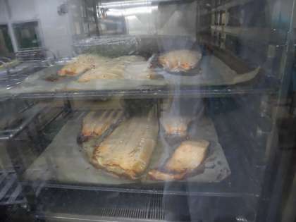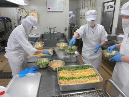 ちらし寿司の鮭は三枚におろしたものを給食室でオーブンで焼き、ほぐしたものです。七夕汁はそうめんを天の川、おくらを星、にんじんを短冊に見立てました。