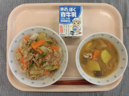 豚丼は豚肉、キャベツ、玉ねぎ、人参を炒めたものをご飯の上にのせました。給食では全員の配膳が終わるのを待っていただきますをします。すぐ食べられるわけではないので、汁気がでないように片栗粉でとろみをつけました。少し甘めの味付けで子どもたちも食べやすかったようです。