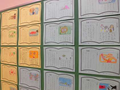 2年生の子供たちの作品が、音楽室前の廊下に掲示されました。どれも力作です。