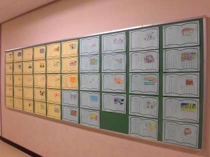 音楽室前の掲示板に、今回は2年生の「紹介カード」が貼られています。一生懸命書いたのが伝わってくる作品です。ぜひ、じっくり読んでみてくださいね。