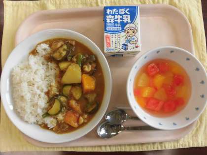 夏休み前最後の給食は、夏野菜カレーライスです。トマトやズッキーニ、なす、さやいんげん、かぼちゃなど今が旬の夏野菜をたくさん使いました。野菜もただ煮込むのではなく、なるべく使っている野菜が分かるように、ズッキーニ、なすはオリーブオイルをかけてオーブンで焼き、かぼちゃは蒸して最後に加えました。