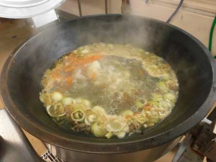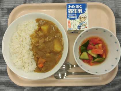 今日から給食が始まりました。休み明けの給食は人気のカレーライスです。休み明けはカレーライスのことが多いのですが、人気があるから、という理由だけではなく、調理師が作り慣れていること、ご飯を炊く炊飯器を使うことや、ルウを作ったり、具を煮込んだり、炒めたりと釜をたくさん使うこと、ルウやあめ色玉ねぎなどは弱火で、具を炒めるときは中火で、と火力を使い分ける作業が多いことから機器の状態を確認することができるという理由もあります。