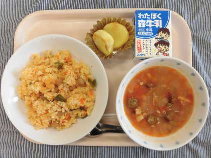 今日は「オリパラ献立」です。来年開催されるオリンピック・パラリンピックに向けて世界各国の料理を紹介しています。今回はアメリカです。「ジャンバラヤ」は魚介類や肉、野菜などを入れたアメリカ南部の米料理です。「ガンボスープ」も同じくアメリカ南部でよく食べられる郷土料理で、ガンボ=オクラを入れています。