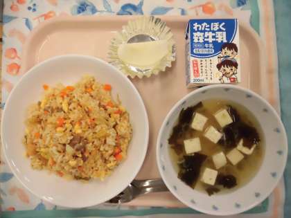キムチチャーハンは、キムチ、人参、長ねぎ、豚肉などを炒め、ご飯と炒め合わせたチャーハンです。キムチは量をそんなに入れないので、辛くないので、1年生でもおいしく食べることができます。給食室で釜を使ってご飯と具を炒めています。